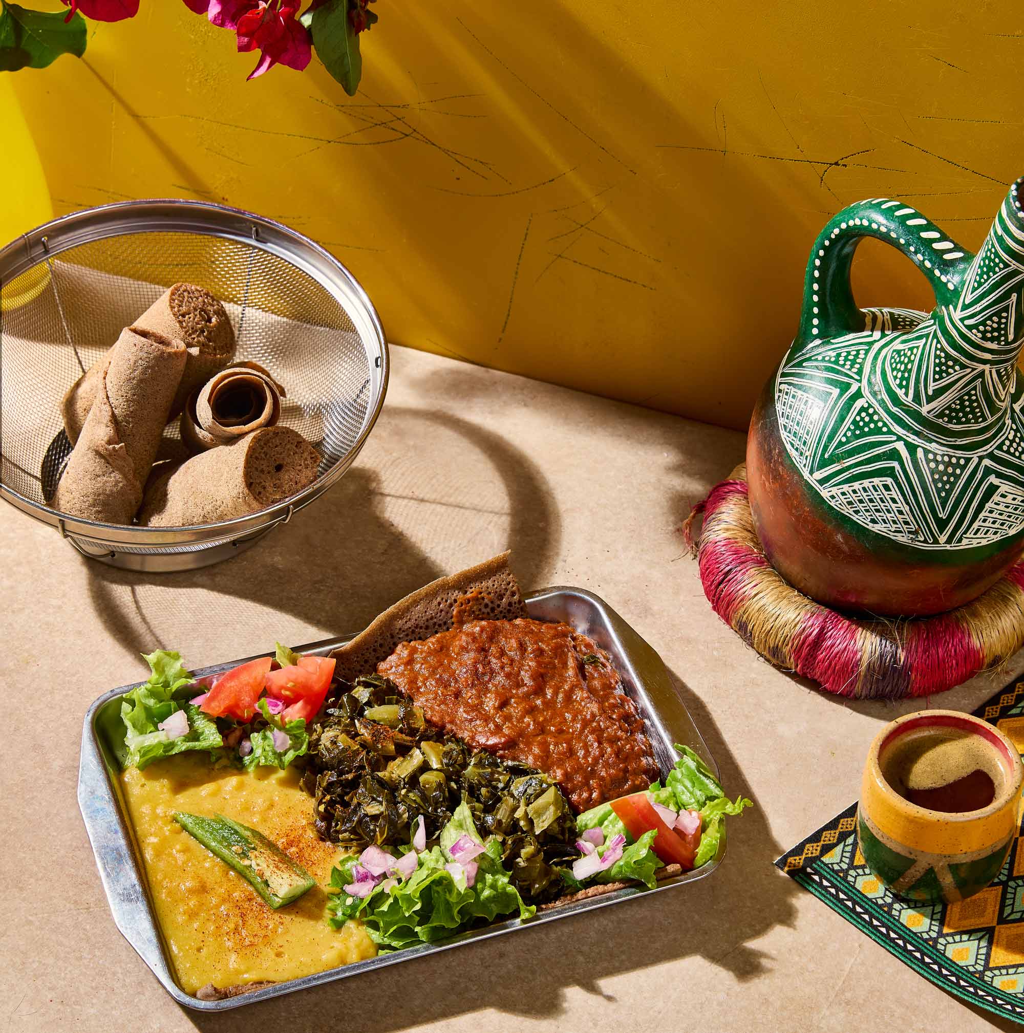 Brundo translates to good food in a messob, the traditional basket that Ethiopian food is often served in.